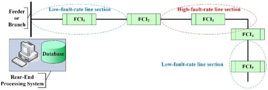 - The FCIs and rear-end processing system separate a distribution system into several line sections. Except for the point-to-point communication performance, the fault rates in various line sections of the distribution system should be taken into account. As shown in Figure 7, some line sections in the distribution system may have higher fault rates or lower fault rates. The higher fault rates will result in high utilization ratios of FCIs in the line sections; therefore, the line sections require better communication performance to preserve the same performance.