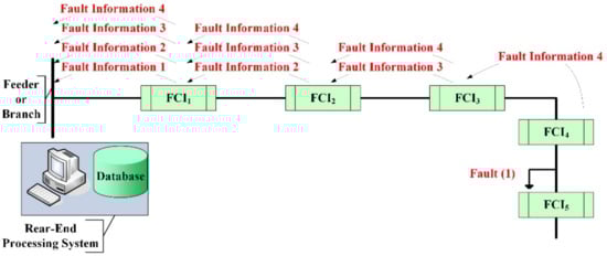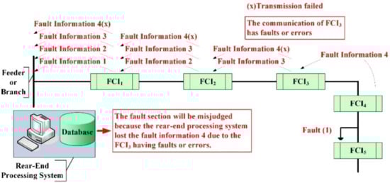 - As shown in Figure 8, the fault information forwarding of FCIs in the FMS is not only a point-to-point process after a fault occurs. For example, the fault location is in the next line section of FCI4 in Figure 8. The fault information forwarding for each FCI is very important to make sure the fault location can be effectively identified. An error in fault information forwarding may cause misidentification of the fault location. As shown in Figure 9, due to the error in fault information forwarding of FCI3, the fault location will be in the next line section of FCI3. This condition will degrade the effectiveness of the FMS. Therefore, the effectiveness of an FMS composed of FCIs in distribution systems does not only greatly depend on the performance of the communication network deployed by the FCIs but also on the failure rates of the distribution systems.