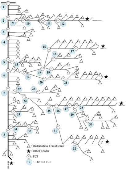 Due to the limited space, only one actual distribution system acquired from Taiwan Power Company, as illustrated in Figure 10, was used to verify the validity of the proposed communication route tracking method. There were 35 FCIs installed in this distribution system according to the optimal FCI placement proposed by []. The FCIs are numbered in Figure 10 and the FLSs for adjacent FCIs are listed in Table 7. From Table 6, it can be seen that there are 35 FLSs. For example, FLS 27 is in the line sections surrounded by FCIs 27, 28, and 29. From Figure 10 and Table 7, the relationship matrix for the FLSs and FCLs can be built and the nonzero terms of the matrix are expressed in Equation (9a). Obviously, it is not easy to find the communication route from Figure 10 for each FLS; however, it can be checked straightforwardly from Equation (9a). For example, if a fault occurs on FLS 31, then can be expressed as Equation (9b). From Equation (9b), it can be checked that the communication route is , , , , , , , , , , , and the rear-end processing system of the substation. Obviously, the communication route of an FLS can be effectively and efficiently tracked by the proposed communication route tracking method,