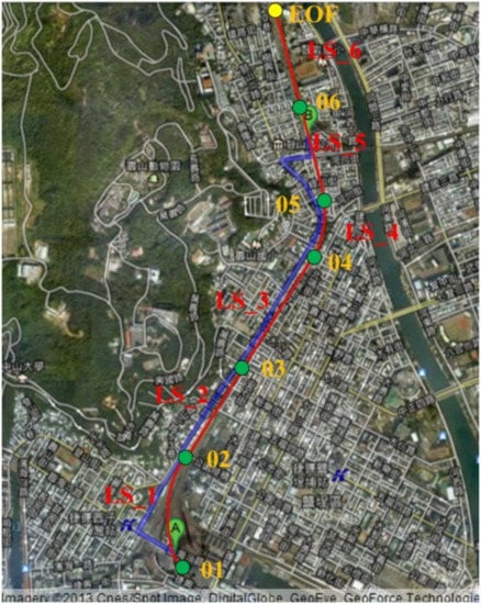 According to the measured PSRs listed in Table 2, the PSR between the candidate locations of FCI01 and FCI02 is quite poor due to the sharp bend as illustrated in Figure 14. Therefore, the candidate locations of FCI01 and/or FCI02 must be changed to reduce the sharp bend. From Figure 17, it can be observed that the candidate location of FCI01 was changed from “01” to “01’” and the distance of LS_1 was reduced to 410 m. Figure 18 shows the measured communication performance of LS_1 after the FCI01 location was adjusted. Table 3 shows the measured communication performance for each line section after the FCI01 location was adjusted. It is observed from Table 3 that the communication performance of LS_1 was upgraded from 20.045% to 97.689%. Other candidate location adjustments can also be done if necessary.