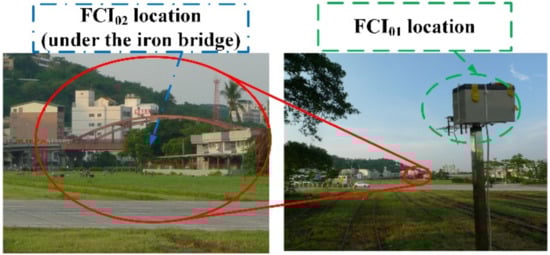 The old railway line at the exit of Sizihwan Station of the Kaohsiung Mass Rapid Transit (MRT) Orange Line was used to simulate a suburban feeder in the following tests. The Google Map shown in Figure 14 was used to estimate the distance and evaluate the topography of the suburban feeder. The candidate locations for FCI placement were selected according to the actual environment of Figure 14. The communication parameters of various line sections could then be measured. As shown in Figure 14, there were six FCIs, FCI01 to FCI06, on the feeder, dividing the feeder into six Line Sections (LSs) for communication performance evaluation. Table 1 shows the distances and the angles between adjacent FCIs for this feeder. From Figure 14, it can be seen that there was a sharp bend between FCI04 and FCI05 (LS_4); therefore, the distance of LS_4 was shortened to 130 m according to the geographic information obtained from Google Maps. Figure 15 shows the photographs of the measured points for LS_1 between FCI01 and FCI02. It is observed that FCI01 was in an open area, and FCI02 was straight under the iron bridge. The mounting height of FCI01 and FCI02 was 2 m, and the distance between FCI01 and FCI02 was about 470 m. There were some barriers such as trees and an iron bridge between these two measuring points. ZigBee channel 21 was selected for the following field communication performance evaluation. The number of measurements was 237. For each measurement, 1000 packets, each 24 bytes, were transmitted.