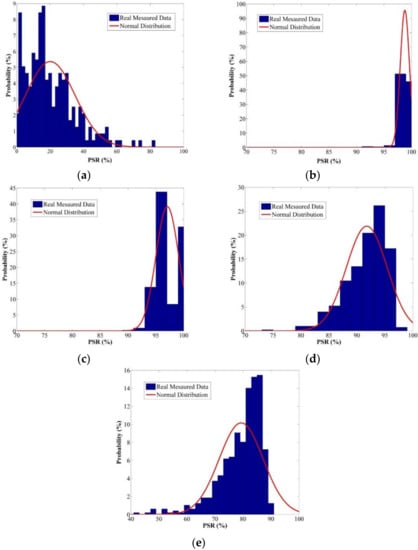 Figure 16 shows the respective PSR PDFs for LS_1 to LS_5 from the measured parameters. Table 2 shows the maximum, minimum, mean, and standard deviation of the measured PSRs. As shown in Figure 16, if the number of measurements is large enough, the measured PSR’s PDF may be close to a normal distribution. Therefore, the normal distribution (red line) can also be used to simulate the communication performance between two adjacent FCIs.