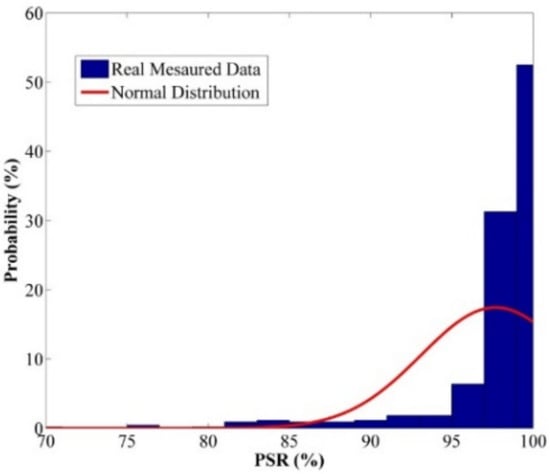 Step 4: In the fault information forwarding mechanism, each FCI generates the PSR probability randomly based on the Cumulative Distribution Function (CDF) derived from the PDF of the measured PSR between the two adjacent FCIs. The fault information is then forwarded to the previous FCI. Therefore, the probability of the fault information being forwarded to another FCI can be established. The Monte Carlo method generates a value between 0% and 100% randomly and uses the PSR CDF to obtain the randomized PSR probability during each simulation. Using the CDF in Figure 12 as an example, when the randomly generated value is 69.2%, the PSR probability is 95.8%.