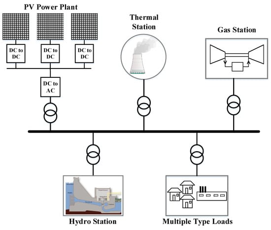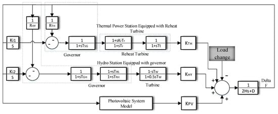 The focus of this work relies on a one-region power network comprising a hydro, thermal, and gas unit combined with a PV system which is shown in Figure 1. A linear model of the entire system for the purpose of LFC study and simulation is illustrated in Figure 2. The model of the hydro and thermal units is deduced from Ref. [,,,], and the model of the PV system with a contribution into the control of the frequency is addressed in Section 3.2.