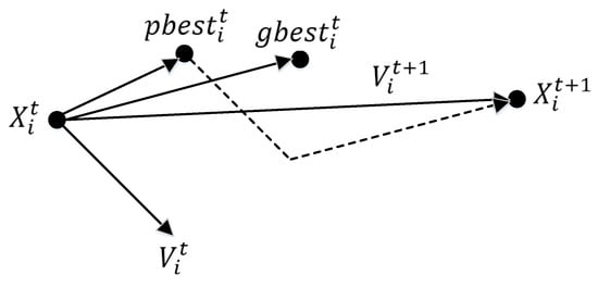 An objective function is established with the purpose of finding if the particle is near or not to the optimal solution. Every particle upholds the two best positions that are occupied. One of the aforementioned particles is that has experienced so far and the other is , representing the best solution practiced by all particles. In addition, the particles’ vectors are updated frequently by Equations (2) and (3) according to Figure 3. The updated population is the particle that is closer to the optimal solution. controls the speed of the next iteration and it is called the inertia weight. Larger leads to a more effective global search while smaller leads to a more efficient local search. (which are limited between 0 and 2) act as factors that conduct the search to local or social areas. Finally, represent generated numbers that are distributed uniformly in the range of and the iteration number is given by t.