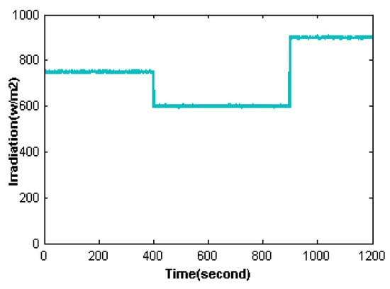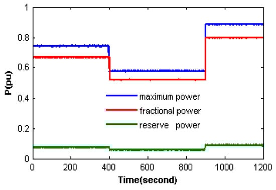 With the intention of assigning a part of the power generated by PVs into the reserve, it is vital to take into account aspects that have an effect on the PV-generated power. As a consequence, the PV module power relies upon three factors: output current (or voltage), irradiation, and temperature. In cases in which it is assumed that irradiation and temperature are constant, the power of the PV modules can be changed by alternating the PV’s voltage at the output terminal. Initially, the voltage () at which maximum power () occurs is quantified by the PSO. Later, reserve power for every module is given by mathematical expression 4 and the modules are required to operate at instead of. Therefore, the converters’ duty cycle of is changed so that is achieved as the boost converter’s output voltage instead of. In this way, whenever it is needed, the PV can raise its power from to by raising its output voltage from to. The power–voltage curve of a well-known PV module BP MSX 60 (Solar Electric Supply Inc., Scotts Valley, CA, US) is depicted in Figure 4. In case of irradiation identical to 1000 w/m2, the module’s maximum power is equal to 60 W and happens at 7.1 V. However, if the module’s voltage is set at 14.6 V, the power of the module ends at 54 W. Consequently, 6 W can be reserved by employing this approach, which is 10% of the generated power. In Figure 4, an example of a PV module with different irradiations over a period of twenty minutes is presented. , , and during this period are represented as per unit in Figure 5.