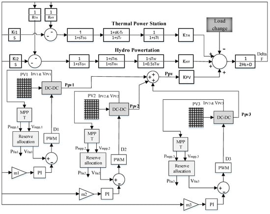 The disparity amongst the load demand and the generated power in power grids is a cause of variations of frequency and power interchange among distinct parts. The load frequency control (LFC) is usually recognized as a solution for the phenomenon of imbalance in the active power of the power grid []. Generally, LFC acts to retrieve the frequency of the system and the exchanging power to their projected value [,]. Recently, the power system has increased in size and complexity which imposes the requirement for intelligent control systems to manage a diverse range of energy resources, including the flourishing renewable energies. The solar energy harnessed through PV systems is becoming one of the most advantageous renewable energy resources (RERs) thanks to benefits such as being abundant, environmentally friendly, having modular structure, having a low cost of operation and maintenance, and an absence of noise which makes it a fitting technology for urban areas. However, the uncertainty due to the variability in their power generation is causing an increased mismatch between the generated power and the load. This property results in continuous deviations from the nominal frequency, so a more effective frequency control in the service is required [,]. Moreover, maximum power point tracking algorithms are typically used by PV systems with the aim of generating the highest probable power in situations where PV systems are connected to the grid. Such a feature is quite useful for exploiting the most out of the resources. However, it does not seem to be very effective for the control of the frequency or load tracking, particularly in microgrids. Such a condition could be even less desirable in microgrids comprised of mixed types of resources of renewable energy, leading to a situation in which ancillary regulation is required [,]. On that basis, and with the constant growing inclusion of PVs into the grid, it will be vital for these systems to deliver a certain level of support to the system stability, as has been traditionally provided by conventional rotating generators.