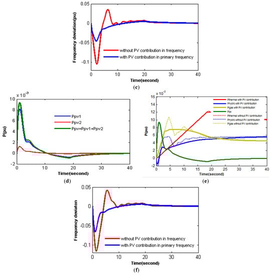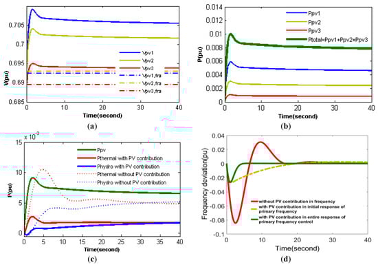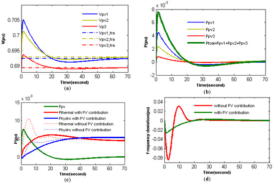 Due to the PV contribution in the entire range of primary frequency control, the PV systems’ PI controller has both and. The outcomes of this simulation can be observed in Figure 9. The PVs’ variation can be witnessed and further verified in Figure 9a. By analyzing the aforementioned Figure 9a, the voltage of the PVs rises as stipulated by Equation (7), and subsequently reaches a ceiling at a voltage higher than of the PVs since it includes PV systems over the entire range of control. Following the changes in the unit’s voltage, the PVs’ power varies as Figure 9b demonstrates. In addition, the power variation of PV (Ppv1 + Ppv2 + Ppv3), hydro, and thermal units is shown in Figure 9c. The variation in the power of the hydro and thermal units remarkably declined due to the PV effect in frequency control. Figure 9c indicates the faster response of the PV systems rather than the hydro and thermal units, a factor which helps the regulation of frequency. Additionally, Figure 9d displays system frequency. The frequency overshoot is correctly eliminated by utilizing an altered objective function. Overall, the participation of PV systems in initial primary control prevents a large frequency drop, whereas, by taking part in the entire primary control, PV systems allow a quicker recovering of frequency.