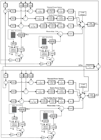 The disparity amongst the load demand and the generated power in power grids is a cause of variations of frequency and power interchange among distinct parts. The load frequency control (LFC) is usually recognized as a solution for the phenomenon of imbalance in the active power of the power grid [1]. Generally, LFC acts to retrieve the frequency of the system and the exchanging power to their projected value [2,3]. Recently, the power system has increased in size and complexity which imposes the requirement for intelligent control systems to manage a diverse range of energy resources, including the flourishing renewable energies. The solar energy harnessed through PV systems is becoming one of the most advantageous renewable energy resources (RERs) thanks to benefits such as being abundant, environmentally friendly, having modular structure, having a low cost of operation and maintenance, and an absence of noise which makes it a fitting technology for urban areas. However, the uncertainty due to the variability in their power generation is causing an increased mismatch between the generated power and the load. This property results in continuous deviations from the nominal frequency, so a more effective frequency control in the service is required [4,5]. Moreover, maximum power point tracking algorithms are typically used by PV systems with the aim of generating the highest probable power in situations where PV systems are connected to the grid. Such a feature is quite useful for exploiting the most out of the resources. However, it does not seem to be very effective for the control of the frequency or load tracking, particularly in microgrids. Such a condition could be even less desirable in microgrids comprised of mixed types of resources of renewable energy, leading to a situation in which ancillary regulation is required [6,7]. On that basis, and with the constant growing inclusion of PVs into the grid, it will be vital for these systems to deliver a certain level of support to the system stability, as has been traditionally provided by conventional rotating generators.