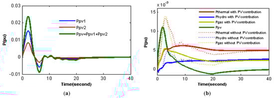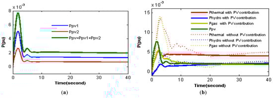Figure 8c presents the variation of PV (Ppv1 + Ppv2 + Ppv3), thermal, and hydro stations. It is clear that the variation in the power of hydro and thermal units diminished remarkably due to the contribution of the PV in the control of frequency, which results in a lower amount stress on such units. Furthermore, as shown in Figure 8c, PVs can respond quicker compared to thermal and hydro units.