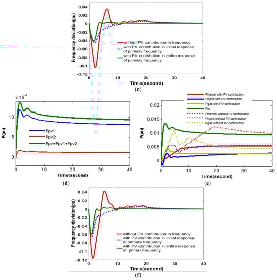 To only involve the PV systems in the initial part of the primary frequency control, the value of in the proposed PI controllers, as stipulated in Equation (7), is set to zero, and the controllers only have the proportional component (). The corresponding simulation outcomes are depicted in Figure 11. The PV powers change as shown in Figure 11a,d. In addition, Figure 11b,e shows the variation of the generation of thermal, hydro, gas, and PV (Ppv1 + Ppv2) units in areas 1 and 2. As can be seen, PV systems respond quickly when compared to hydro, gas, and thermal units. Therefore, the involvement of a PV system in the control of the frequency with an altered objective function improves the system frequency significantly (decreases undershoot, overshoot, and settling time) as depicted in Figure 11c for area 1 and Figure 11f for area 2. Furthermore, the variation in the power of the hydro and thermal units due to a frequency event is remarkably decreased, which means placing a lower amount of stress on such types of units.