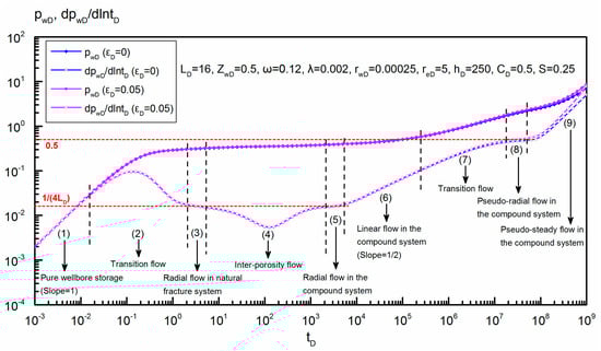 As mentioned before, fracture porosity and fracture permeability are variable since they are related to reservoir pressure. Several approaches have been proposed to incorporate geomechanical effects into the simulation and characterization of elastic media in the literature [17,18,19,20,21,22]. Nur and Yilmaz [17] defined a stress sensitivity coefficient to account for permeability variation, and Kikani and Pedrosa [18] further rewrote it as a form of exponential function. This exponential relationship becomes one of the most common expressions and is widely used to describe stress-sensitive reservoirs. On the basis of this relationship, Ceils et al. [23] and Samaniego and Villalobos [24] investigated the effect of stress sensitivity on the transient flow behavior of naturally fractured reservoirs. Similarly, Yao et al. [25] presented a new semi-analytical model for hydraulic fractures with stress-sensitive conductivity, and Zhang et al. [26] also developed an improved model for a finite-conductivity fracture with stress-sensitive fracture permeability. These proposed models highly depend on the exponential relationship between fracture permeability and reservoir pressure. However, stress sensitivity coefficient is mainly obtained by fitting the experimental data measured from the laboratory and it may have a certain error due to the difference between the experimental environment and the actual reservoir conditions [8,17,18]. There are still other approaches to deal with stress sensitivity. Raghavan and Chin [20] established a numerical model coupling geomechanical and fluid-flow aspects to examine the fracture permeability reduction from the partial closure of natural fractures. Rosalind [27] proposed an approach that avoids using pseudo-pressure function to handle stress sensitivity, but this approach is limited to a linear variation of permeability and porosity.