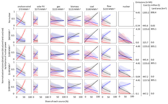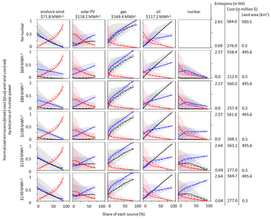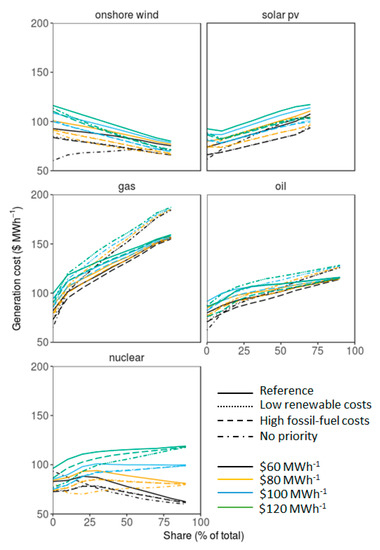 We did not attempt to estimate the required backup capacity due to changes in the correlations between demand and variable-renewable generation patterns. However, the lower the correlations and higher the penetration of variable renewables, the more the backup capacity requirement rises [27,28]. In the worst case, equal amounts of backup and installed capacity of variable renewables is required to prevent electricity supply discontinuities when the sun does not shine, and the wind does not blow. Increasing the share of onshore wind power increased the simulated system-level generation costs when renewables’ priority dispatch is withdrawn, and the generation cost is then higher than nuclear power, due to large amounts of spilt generation.