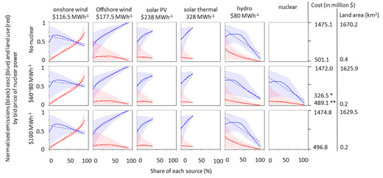 Tasmania example: cost (blue) and land use (red) and its median for each section (continuous) based on incremental 5% changes in the share of each source of total annual generation, along with regression graphs (dotted) showing the share of each electricity source. Each plot is redrawn from the same output to display the changes by share of each source. Note that the current greenhouse-gas emissions from electricity generation are 0 in Tasmania owing to its near-exclusive reliance on hydroelectric power (if inter-connector trading to the mainland is disregarded). * Minimum generation cost when the average generation cost of nuclear power is $60 MWh−1. ** Minimum generation cost when the average generation cost of nuclear power is $80 MWh−1.