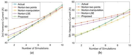 Comparisons of 3rd (a) and 5th (b) harmonic current estimation by proposed method and Norton-based methods.