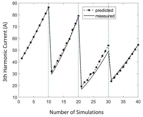 In generating harmonic predictions, the measurements of 40 simulations are divided into five groups, with each group containing eight measurements. The forgetting factor is set as 0.2. Figure 7 shows the variations of predicted harmonic currents using recursive identification method. Dashed lines represent the time stamps with parameters changing. The 3rd harmonic current estimations by the recursive method show deviations from measurement to some degree, especially at the time of admittance-related parameters changing. However, the deviations are narrowed gradually along with time. Also, after applying other values of forgetting factor, similar results with Figure 7 are obtained. Considering the overall pattern between results of recursive identification and measurements, the current predictions made by recursive method are quite consistent with the measurements.