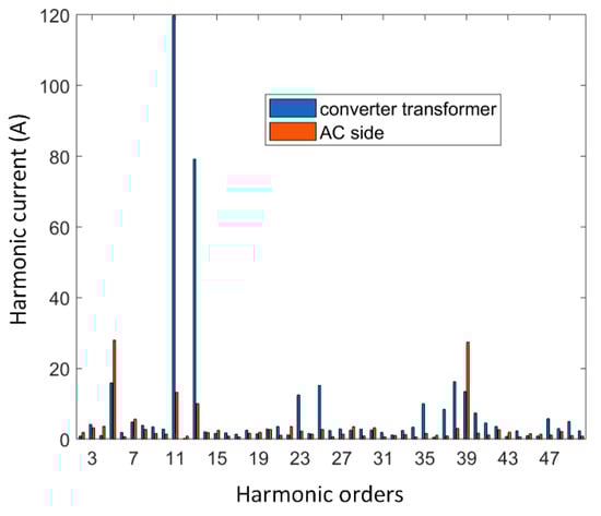 Figure 8 shows the comparisons between the harmonic current of two monitoring sites, located in converter transformer and AC network side separately. For both monitoring points, 5th, 11th, 13th, 23th and 25th harmonic current contents, together with high-frequency harmonics such as 35th, 38th and 39th, are significant compared with harmonic current in other orders. The 11th and 13th harmonic current on AC side is much lower than that on transformer side, due to the effect of filter branches. The 5th and 39th harmonic current emissions on AC side are even larger than that on transformer side, probably due to the accumulation effect made by several transformer branches.