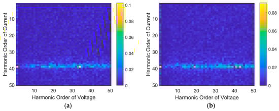 The admittance matrix, that is, and , are estimated and shown in Figure 9. It shows that the admittance of 39th is relatively high, indicating that it has potential of harmonic resonance in this order. In addition, there is no obvious diagonal stripe in the figures, therefore, the background voltage in the same order does not contribute most to the harmonic current.
