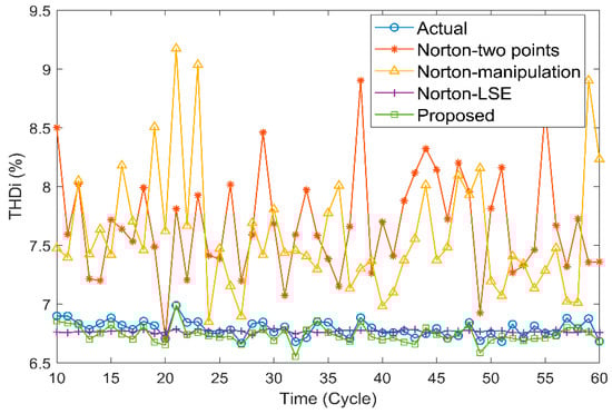 Figure 10 shows comparisons between different methods. It can be seen that THDi produced by method of Norton-two points and manipulation is approximately 1% higher than the actual ones. Norton-LSE method and the proposed method both gave better performance. In detail, Norton–LSE method gave relatively invariant estimations for the whole time period, while the THDi produced by the proposed method shows a similar pattern to the actual ones.