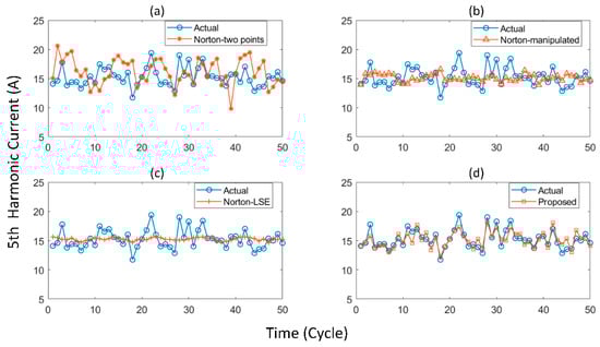Comparisons of 5th harmonic current between actual measurement and estimations by Norton-two point method (a), Norton-manipulated method (b), Norton-LSE method (c) and the proposed method (d).
