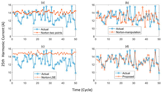 Comparisons of 25th harmonic current between actual measurement and estimations by Norton-two point method (a), Norton-manipulated method (b), Norton-LSE method (c) and the proposed method (d).