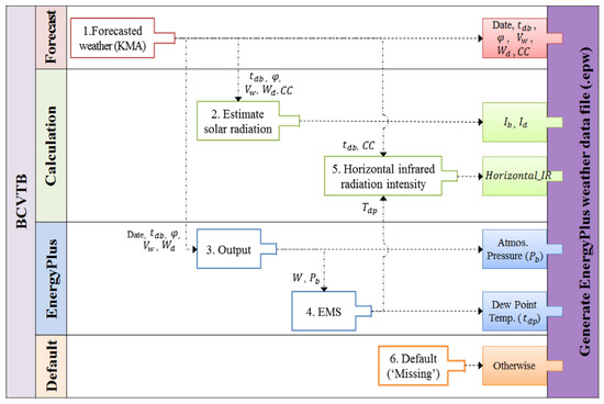 BCVTB is used for coupling various simulation tools for co-simulation and co-simulation to hardware. Refs. [13,46,52] used BCVTB to ease the simulation process by coupling EnergyPlus, Matlab in their model for building energy performance analysis. Meanwhile, BCVTB was coupled with EnergyPlus to generate real-time weather data file for energy consumption prediction in one day [49]. Figure 1 shows the process of generating a weather data file based on the forecasted weather using BCVTB as a coupling platform between EnergyPlus and other tools. The weather elements from weather forecast by national weather station, calculated weather parameters, measured weather elements, and default parameters are coupled together in BCVTB platform for generating weather forecast.