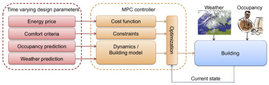 Figure 3 illustrates the basic principle of MPC model structure [74], the inputs of the systems are time varying parameters: energy price can be taken from energy market, comfort conditions set by the occupants, occupancy prediction, and environmental parameters. The MPC system formulates the optimization of an objective function by using building dynamic model, a cost-function and constraints. After each time sample formulation, feedback from occupants and weather conditions are fed back to MPC for the formulation of next time sample, which ensures that unanticipated disturbances are taken in consideration through feedback loop.