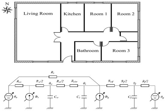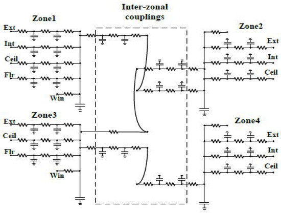 A simplified low order gray box modelling has been introduced in [75]. The study considered a whole building as single zone building (Figure 4) neglecting the inter-zone heat exchange. Most of the studies in literature did not take account of inter-zone thermal interactions as it increases the complexity of the model and includes numerous uncertainties. In addition, the model perform-ability declines with the increase of the number of zone. However, Cai and Braun [76] proposed a resistance capacitance thermal network model for multi-zone buildings (Figure 5) with a unique three-step estimation approach to reduce the complexity of the model and thus improving the performance of BEMS system, through: