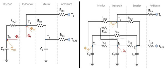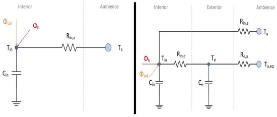 Four gray box model structures were developed in this paper: (1) 1R1C—the simplest structure characterizes the whole building into a single parameter (Figure 6); (2) 3R2C—consists of three resistors and two capacitors. Three resistors indicate convective and radiative heat exchange, and heat exchange between interior to environment, two capacitor indicates interior and exterior thermal mass (Figure 6); (3) 4R2C—extension of the 3R2C structure with additional indoor node (Figure 7); and (4) 8R3C-extension of the 4R2C considering all type of heat exchanges between interior, exterior, heating elements, and indoor air (Figure 7).