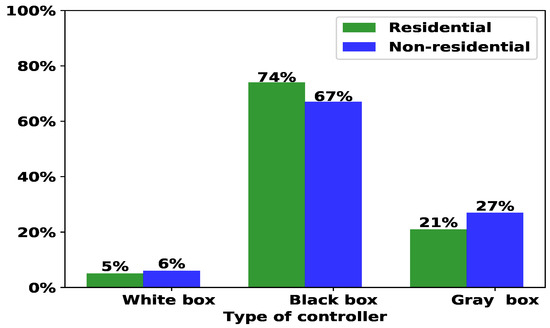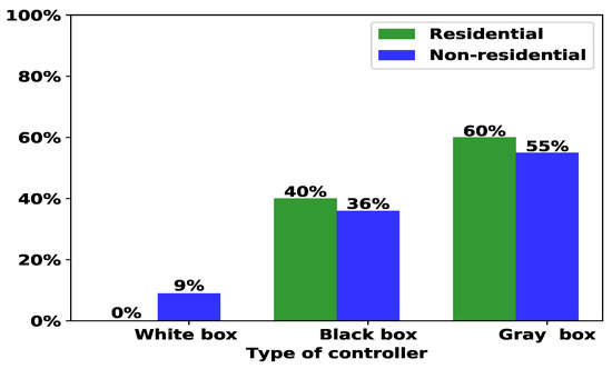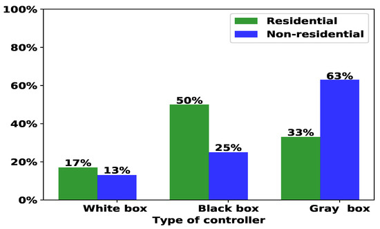 Towards sustainable development, installation of renewable energies are important. This factor has also been considered in the literature review. The literature review highlights 16% and 23% renewable energies integration into non-residential and residential buildings, respectively (Figure 11). Most of RES integration is observed in smart grid and in big buildings context. The dynamic response in energy consumption by loads is an effective way of maintaining grid balance, grid durability, and cost optimization. Around 22% of non-residential and 25% of residential buildings have adopted DR. In Figure 12, it can be noticed the controller types used for DR application in both building types. Gray box modelling has higher implementation percentage because of the high flexibility for multi-objective optimization. Controllers used for RES integration are shown in Figure 13, where it should be noticed that black box models have higher percentage of implementation in residential buildings and gray box modelling in non-residential ones. This difference can be justified as follows: (1) Gray box models are characterized by high accuracy and higher computational cost that limit their usage only for large buildings; while (2) black box models are characterized by high accuracy and lower flexibility of MIMO that limit their application to multi-objective optimization purpose. In the literature review, it had been found that black box models includes controllers such as fuzzy logic, artificial neural networks, genetic algorithms, decision trees, particle swarm optimization, reinforced learning, etc., while gray box models includes lumped capacitance model, model predictive controller, hybrid systems, etc.
