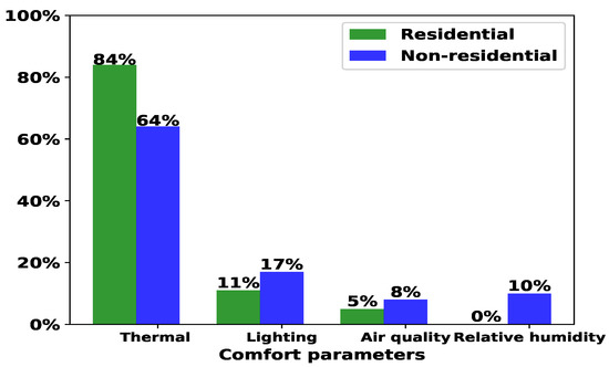 In the context of comfort parameters, thermal comfort acquired more importance in both non-residential and residential buildings, whereas, other parameters are taken into consideration in few papers (Figure 10). This indicates the significance of thermal comfort in overall indoor comfort sensation and optimization of thermal energy leads great amount of overall energy consumption reduction in comparison to other comfort variables energy consumption optimization. There is a major lack in consideration of indoor air quality and lighting control. However, regulations and standards urge maintenance of CO2 and luminance level in order to keep occupants good health and productivity, hence more research on this topic is necessary. Only 5% of the papers have developed controller for all four comfort parameters control. This shows the difficulties in implementation of controller for overall indoor comfort management.