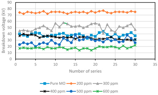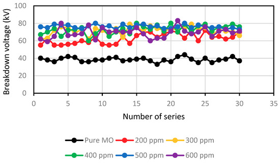 The dielectric breakdown (BDV) measurements were performed with a Foster Oil Test 90 type with a test cell of 500 mL according to the IEC 60156 standard [26]. The electrode arrangement consisted of two brass hemispheres 12.5 mm in diameter and an electrode gap of 2.50 ± 0.05 mm. An alternating voltage ramp rate of 2 ± 0.2 kV/s was applied continuously from zero to breakdown. The breakdown voltage is the average of 30 successive measurements and the time delay between the successive measurements was 2 min. For the Weibull distribution, we performed another series of measurements. It is to have a power of 2 (24 = 16) and to deduce the slope of Weibull plots. Sixteen is a reasonable number for a Weibull analysis.