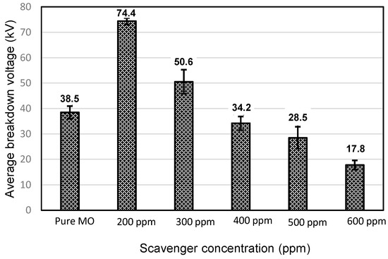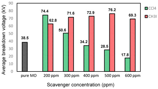 The breakdown voltage for various concentrations of the mineral oil (MO)/CCl4 scavenger.