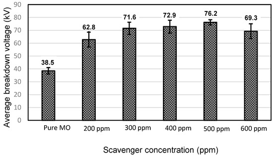 Mineral oil-based electronic scavenger samples were prepared by adding the scavenger in concentrations ranging from 200 to 600 ppm by micro-pipit into 500 mL of dry oil. The liquids were mixed with the aid of a magnetic stirring process at ambient temperature and at a speed of 1100 rpm for about 15 min. Then, the electronic scavenger samples were placed in the ultrasonic homogenizer for 30 min to obtain a homogeneous dispersion fluid. Then, the samples were kept under a vacuum of 0.16 MPa for 24 h to eliminate humidity and internal bubbles.