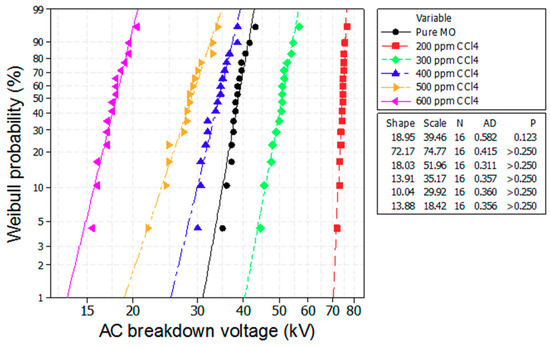 Weibull plot of the breakdown voltage of the mineral oil with various scavenger additives of CCl4.