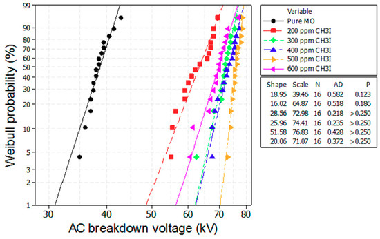 Weibull plot of the breakdown voltage of the mineral oil with various concentrations of the CH3I scavenger additive.