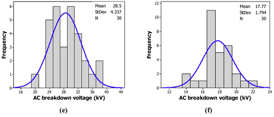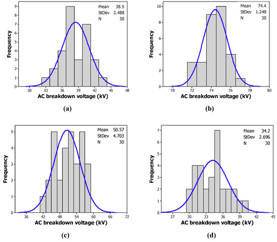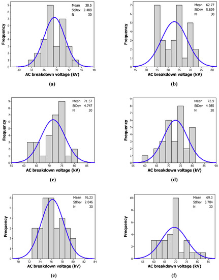 4.2. Histogram and Normal Distribution of the AC Breakdown Voltage of the Investigated Samples