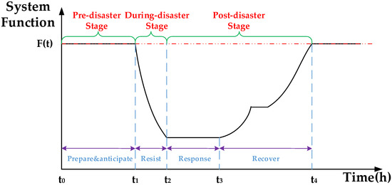 According to [4], power system resilience is “the ability of the power system to anticipate high-impact low-probability events, rapidly recover from these disruptive contingencies and absorb lessons for adapting its operation and structure for preventing or mitigating the impact of similar events in future.” According to the evolving nature of general disasters, reference [5] divided the research of power system resilience into three parts: pre-disaster system toughness, during-disaster system resistance and post-disaster system restoration ability, as shown in Figure 1. As the core part of resilience research, the enhancement strategies of resilience can also be implemented from the three aspects. Pre-disaster improvement mainly belongs to the scope of hardening measures, while during-disaster and post-disaster improvement are dominated by smart operational measures. Before the occurrence of disasters, it is essentially to optimize power system resilience-oriented planning [6,7,8], identify and strengthen the weak links [9,10], as well as allocate the disaster repair resources optimally [11,12]. During disasters, effective and flexible control measures [13,14] should be taken to avoid cascading failures and restrict the further expansion of failures. After disasters, how to rapidly repair the damaged components and restore curtailed load with limited resources [15,16,17] is the most urgent and significant task for power system restoration. In [18], an analysis of lifelines in case of seismic disaster under the analysis FMECA was presented. Reference [19] reviewed the challenges of maintaining the linear assets and provided a conceptual framework for the use of autonomous inspection and maintenance practices. This paper emphasizes the enhancement of resilience in the post-disaster stage.