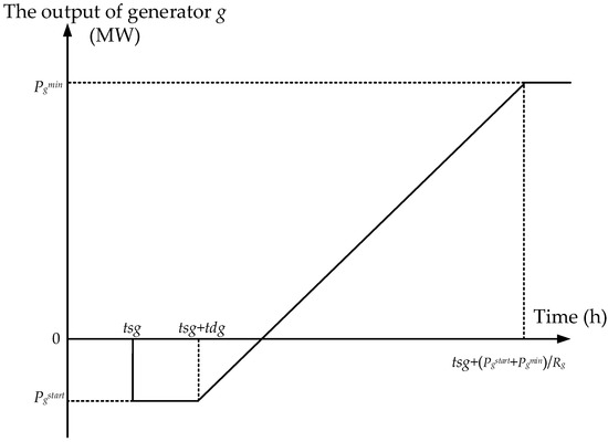 The damage of bus will result in the outage of generators on it and these generators will not be started up until the bus is repaired. If SSg,tsg equals to 1, unit g is started up at tsg, as shown in Figure 2 [33]. Once the generator is started up, it has to absorb power from the power system (without considering generators with black start ability). Then the generator has the capability to transmit power to the system after its auxiliary power is self-sufficient. The simplified restoration process of generators is shown in (34)–(39).