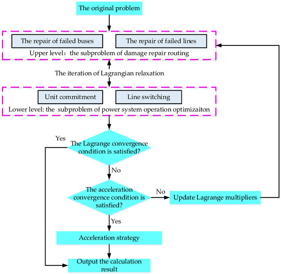 Though the original model is transformed to a MISOCP, it is still a large-scale and complex problem, which is hard for ordinary solvers to solve. The LR method is a decomposition and coordination algorithm and its computational effort increases linearly with the scale of problem, so it is suitable for the solution of the modified model. The MISOCP model can be decomposed into the upper sub problem of routing repair teams and the lower sub problem of power system operation optimization by LR and then calculated by iterative solution. Further, to tackle the concussion and slow convergence of LR, the acceleration strategy is designed to speed up the solving process.