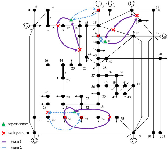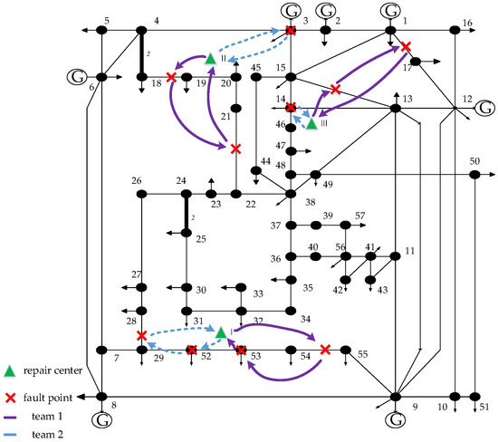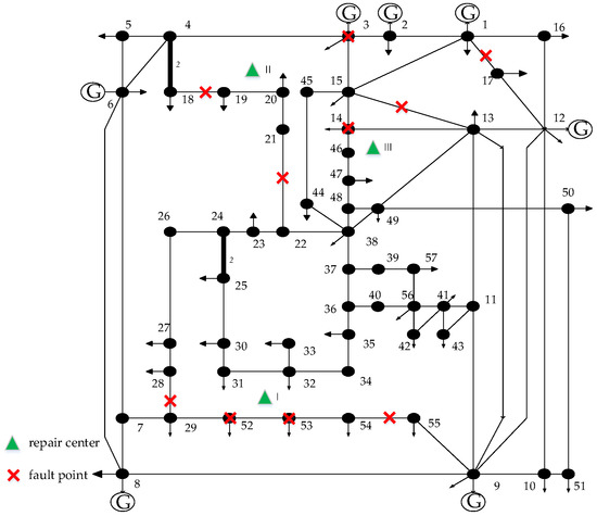 In the case study, it is assumed that the power system is hit and disturbed by a severe typhoon. The damage locations of the post-disaster power system are known, as shown in Figure 4. The distance between different fault points, the distance between fault points and repair centers, the needed damage repair resources and time of fault points, the resource amount of repair centers and the economic loss of lost load are displayed from Table A1, Table A2, Table A3, Table A4 and Table A5 in Appendix A.