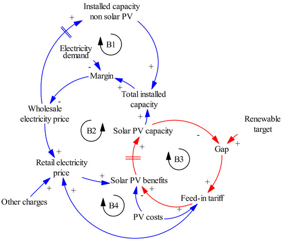 The main dynamic hypothesis of this study is shown in Figure 1, with the feedback cycles formed by blue arrows. This describes how PV diffusion is influenced by the electricity market, which is modeled by the interactions between supply and demand sides. The same dynamic hypothesis is shown again in Figure 2 and Figure 3. However, in Figure 1, a feedback cycle with red arrows is added to describe the feed-in tariff scheme, while the red-marked structure in Figure 2 and Figure 3 represent the net metering and capital subsidy schemes, respectively. Next, the main dynamic hypothesis is carefully described.