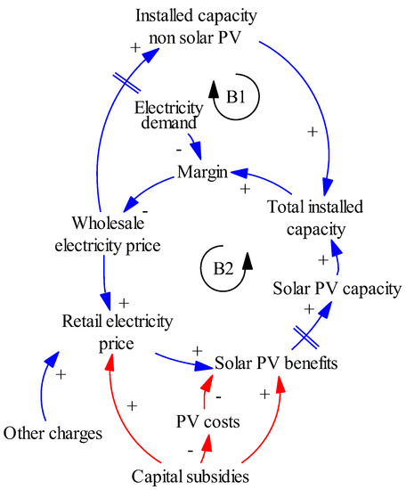 The balancing loop B2 in Figure 1 shares some of the variables from cycle B1. In cycle B2, the retail electricity price results from the sum of the wholesale electricity price, other charges, and the cost of implementing the solar PV policy, i.e., a feed-in tariff, net metering, or capital subsidy scheme. The retail electricity price is paid by consumers in exchange for electricity, with the willingness to adopt a solar PV system depending on the benefits of having one. The benefit of having a solar PV system includes the retail electricity price and PV costs as part of its calculation; in other words, this benefit results from an economic comparison between the production of solar PV against the demand for power from the grid. Finally, the benefits of PV encourage investment in solar PV.