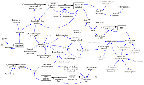 Much research has been devoted to assessing the effect of policy on the diffusion of solar PV for industrialized countries [19,24,25]. Some studies have even focused on analyzing the performance of policies under criteria such as effectiveness and efficiency [26,27,28]. However, research relating to nonindustrialized countries is limited. This is particularly the case for the Colombian electricity market, although efforts have been previously made focusing on the transformative effect of distributed solar PV on the country’s power industry [29,30,31]. The objective of this paper was therefore to assess different policies to promote solar PV investment in the Colombian residential sector. The three policies—feed-in tariff, net metering, and capital subsidy—were analyzed using the criteria of efficiency and effectiveness. To reach this objective, a simulation model based on SD was built.