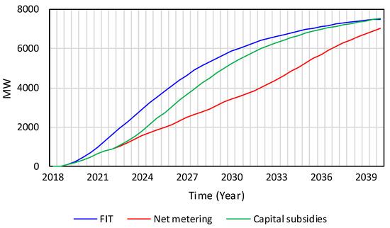 The simulation results show that in terms of effectiveness, as can be deduced from Figure 6, feed-in tariff scheme reaches better results than net metering and capital subsidies. However, by the end of the year 2040, both feed-in tariff and capital subsidies reach the same level of solar PV deployment. Under these policies, the predicted installed capacity of solar PV systems in 2040 will be about 7532 MW. However, during the simulation period, the feed-in tariff scheme is more effective to accelerate the investments of solar PV systems compared to capital subsidies, given that cumulative installed capacity with feed-in tariff always exceeds capital subsidies. In addition, net metering seems to be the least effective policy—when this support instrument is in place, it shows the lowest level of solar PV capacity installed. Under net metering, the number of solar PV systems in 2040 will be 7029 MW.