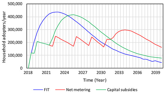 Figure 7 shows the adoption rate, i.e., period-by-period adoption, and corresponds to the innovation adoption curve. The adoption rate is influenced by potential adopters among other variables. Potential adopters in turn depend on households willing to adopt, which is a function of the benefit of having a solar PV system. This latter variable is calculated according to each policy (see Equations (6)–(8) in the Section 3.2.2) and has the main influence on PV adoption rate.