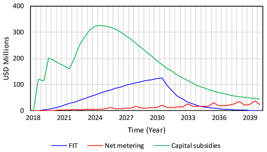 Figure 8 provides the costs of solar PV policies per year during the simulation period. Regarding the feed-in tariff scheme, the cost of this policy is proportional to the feed-in tariff rate, which is an endogenous variable that increases until PV cumulative installed capacity reaches the PV target; this explains why feed-in tariff starts to fall after 2030. Capital subsidies of 30% are the most expensive policy, and the cost of capital subsidies follows the behavior of the adoption rate. The least expensive policy is net metering, although the cost of net metering follows a growing trend.