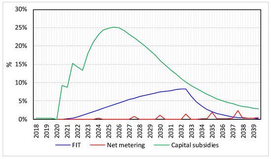 Among the components of retail electricity tariff, the cost of PV policy (PV energy charge) was analyzed next. The percentage contribution of PV energy charge to retail electricity tariff is shown in Figure 10. The feed-in tariff scheme contributes up to 12% to retail electricity tariff. In contrast, net metering contributes up to 4%. As expected, if capital subsidies are applied, this makes up the charges. The capital subsidy has the most significant impact on the retail electricity tariff, with the policy contributing up to a 30% to the tariff in total. Therefore, in terms of costs charged to the final consumers, the results are consistent with the total cost of the policy shown in Figure 8.