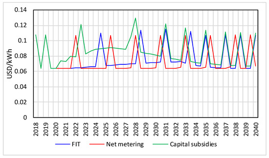 In this subsection, it is explained how each policy is established and how its cost is calculated. Net metering uses retail rates to compensate PV generation. Capital subsidies assume a fixed percentage of 30% over the total system installation investment. Feed-in tariff rate depends on the gap between cumulative solar PV () and solar PV target (), as shown in Equation (12).