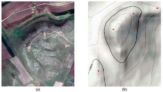 The layout and the contours of the quite complex hilly terrain (source: adapted from Google Maps). (a) The layout of the terrain (satellite view); (b) The contour of the terrain level (terrain view) and the positions of the turbines